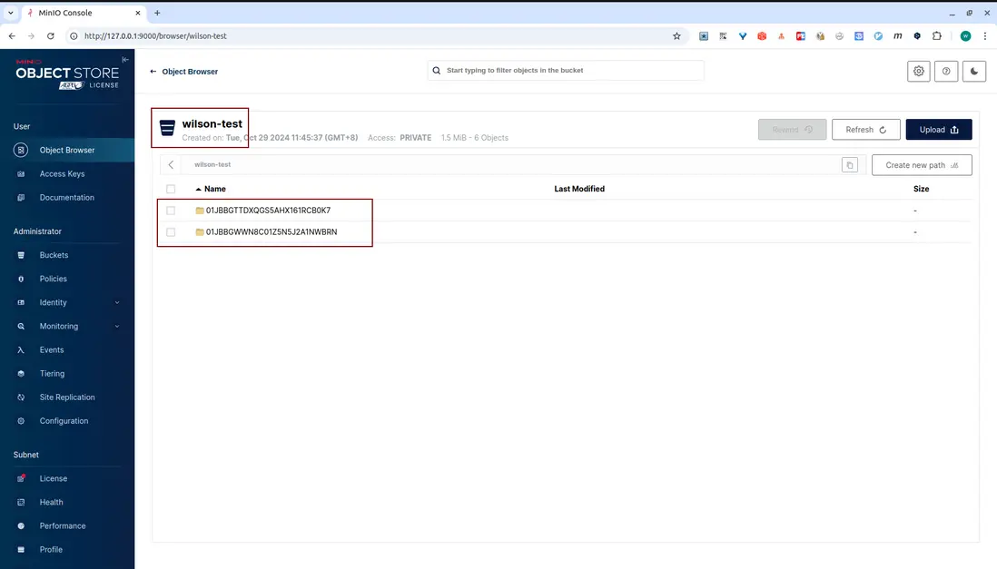 通過用户名密碼登錄web頁面http://127.0.0.1:9000/,然後創建bucket,再創建access key