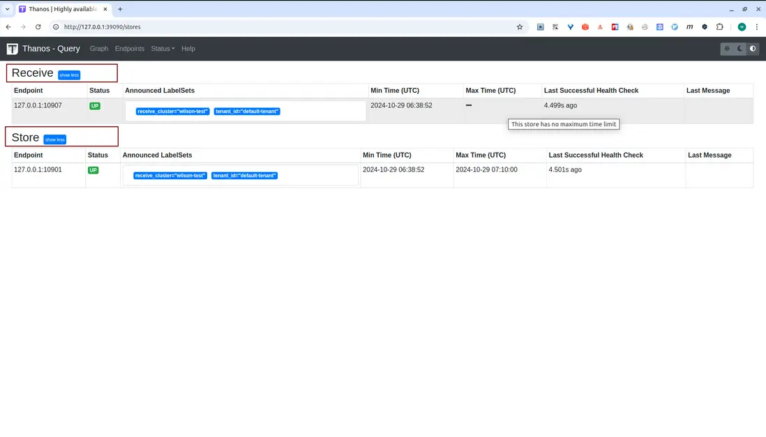 127.0.0.1:10901就是新增的store的grpc地址,添加完畢後,檢查thanos-query的web頁面