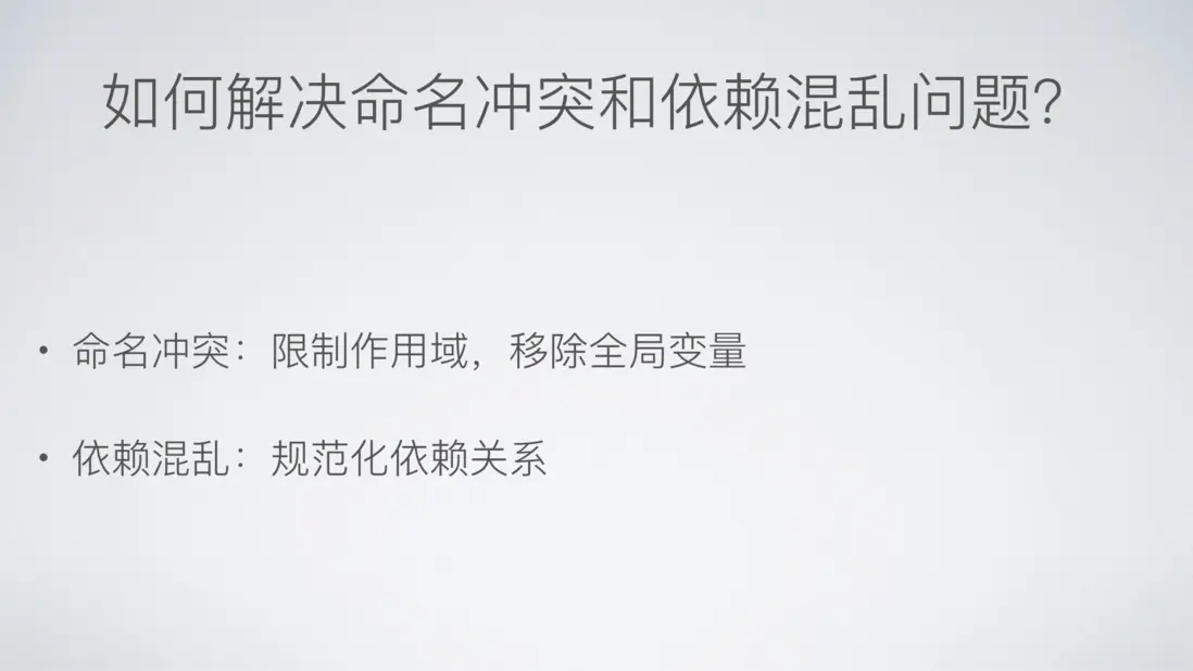 首先,之所以我們會有命名衝突問題,是因為那些 .js 文件都是共享作用域的,而且它們還定義了一些全局的變量。我們要做的,就是要 限制作用域,並且 移除全局變量。還有依賴混亂問題,我們可以通過規定一些特殊的語法,來在代碼中聲明依賴關係,再開發一個工具來自動化處理文件之間的依賴,就可以解決依賴混亂的問題了。