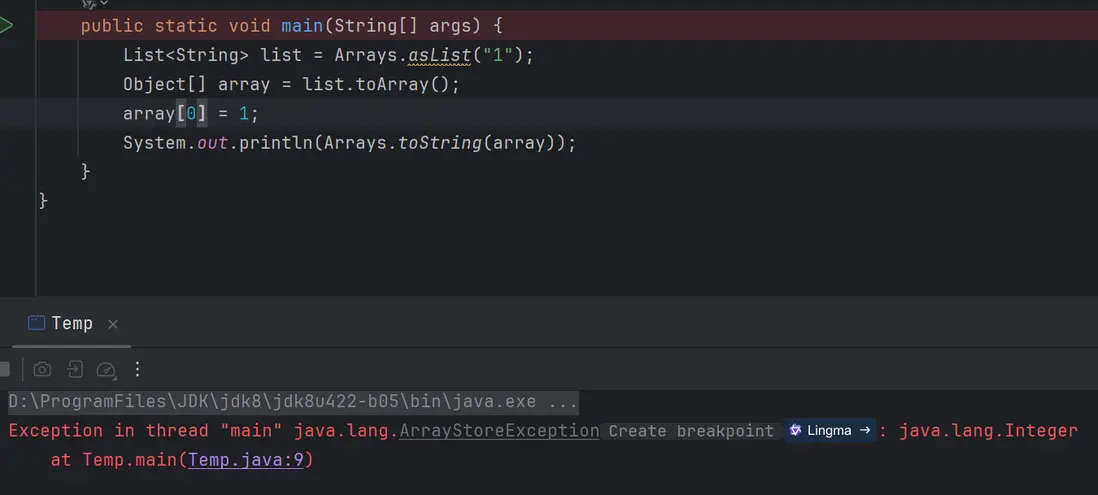 再次執行代碼,結果就會拋出 ArrayStoreException 異常,這個異常表明這裏並不能把一個 Integer 類型的對象存放到這個數組裏面。如下圖所示: