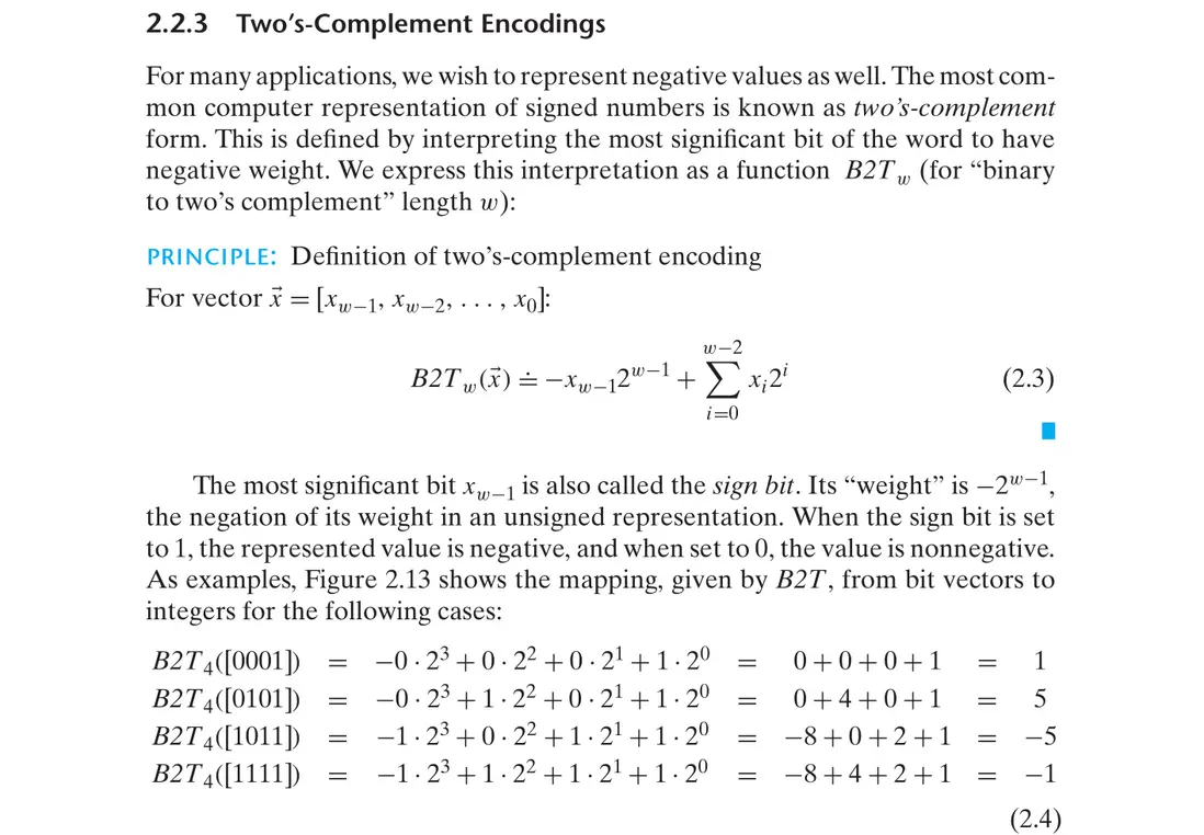 補碼就是將二進制位的最高位作為符號位,它的權重是 -2^(w -1) (這裏的 w 為比特位的個數) ,如果它設置為 1 表示負數,如果設置為 0,表示非負數。如下圖所示: