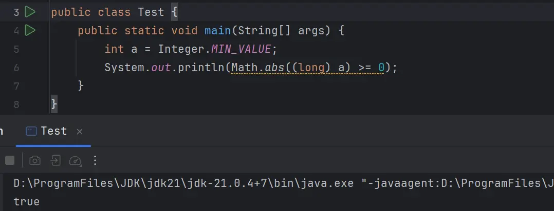 從輸出可以看到因為 Math.abs(Integer.MIN_VALUE) 的結果還是 Integer.MIN_VALUE,因此它是小於 0 的,這個也解釋了上面判斷大於等於 0 結果有可能輸出的是 false。