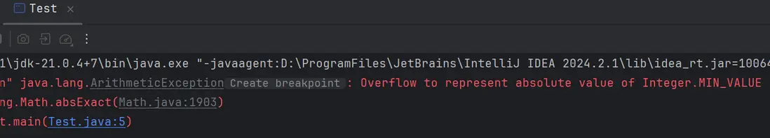 一種是使用 Math.absExact() 方法,該方法在獲取絕對值之前會判斷是否超過了表示範圍,如果超過了表示範圍會拋出一個異常,如下圖所示: