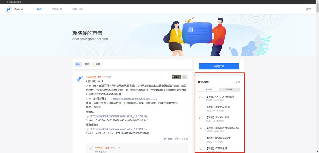 其中吸引本狗亮點還在於有強大的更新迭代能力,Pixpin以用户的角度出發,專門開放意見反饋專區,並以社區投票形式進行版本迭代,使功能更加貼合用户需求。