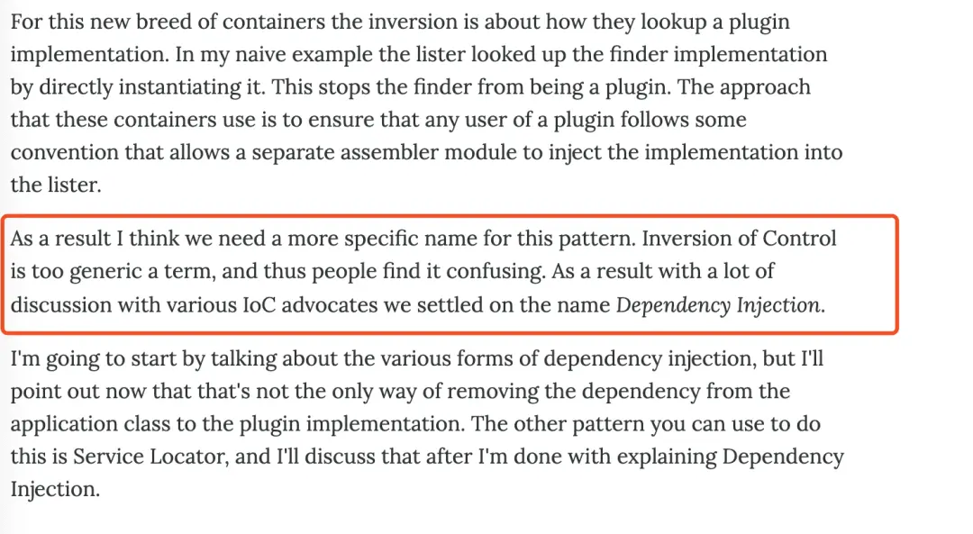 老馬(Martin Fowler)在一篇文章中提到將 IoC 改名為 DI,原文如下,原文地址:https://martinfowler.com/articles/injection.html 。