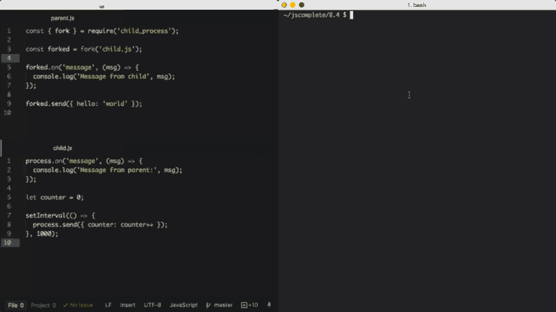 當執行上面程序中的parent.js文件時,它首先向下發送{ hello: 'world' }對象,forked的子進程打印一個消息(Message from parent: { hello: 'world' }),然後child.js將每秒發送一個遞增的數值給父進程打印消息(Message from child{ counter: 0 })。