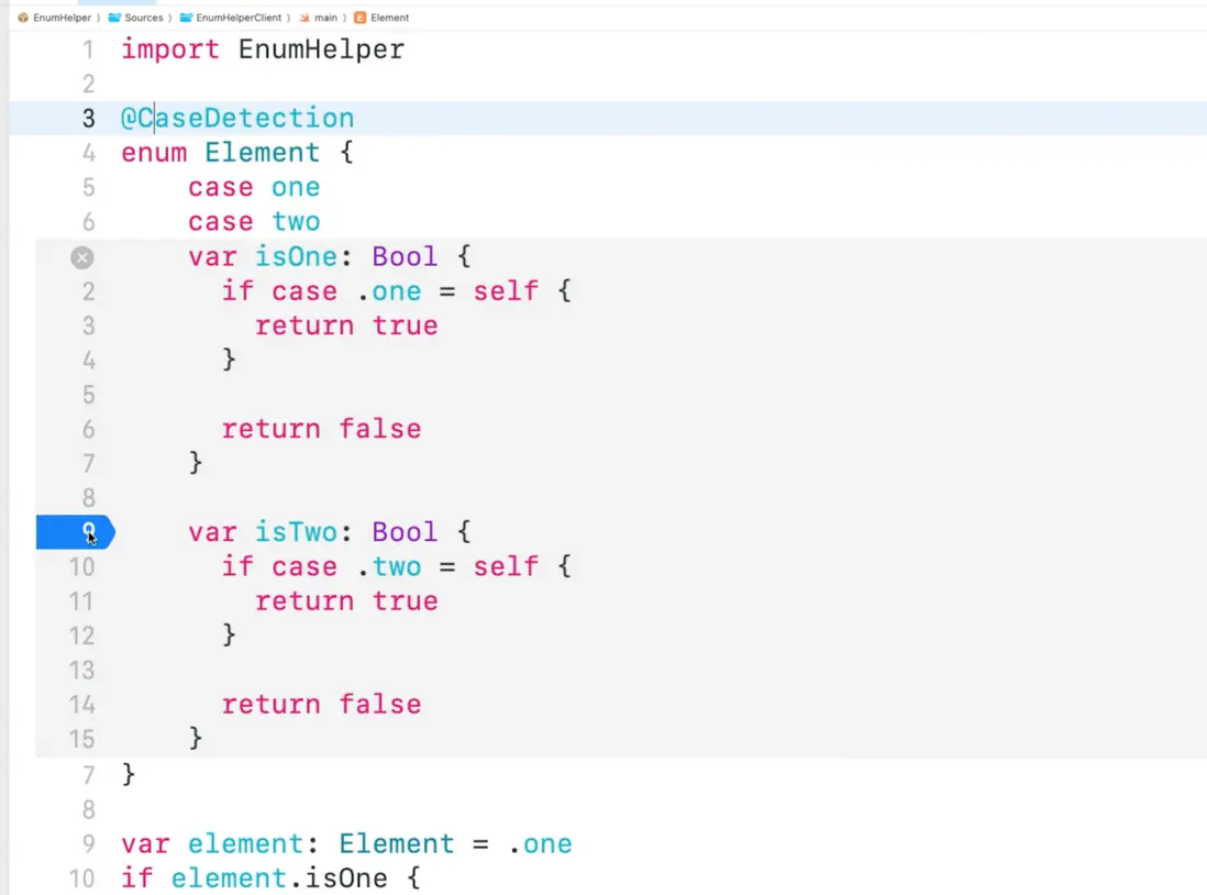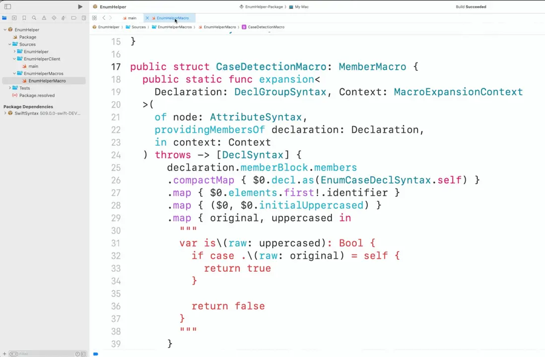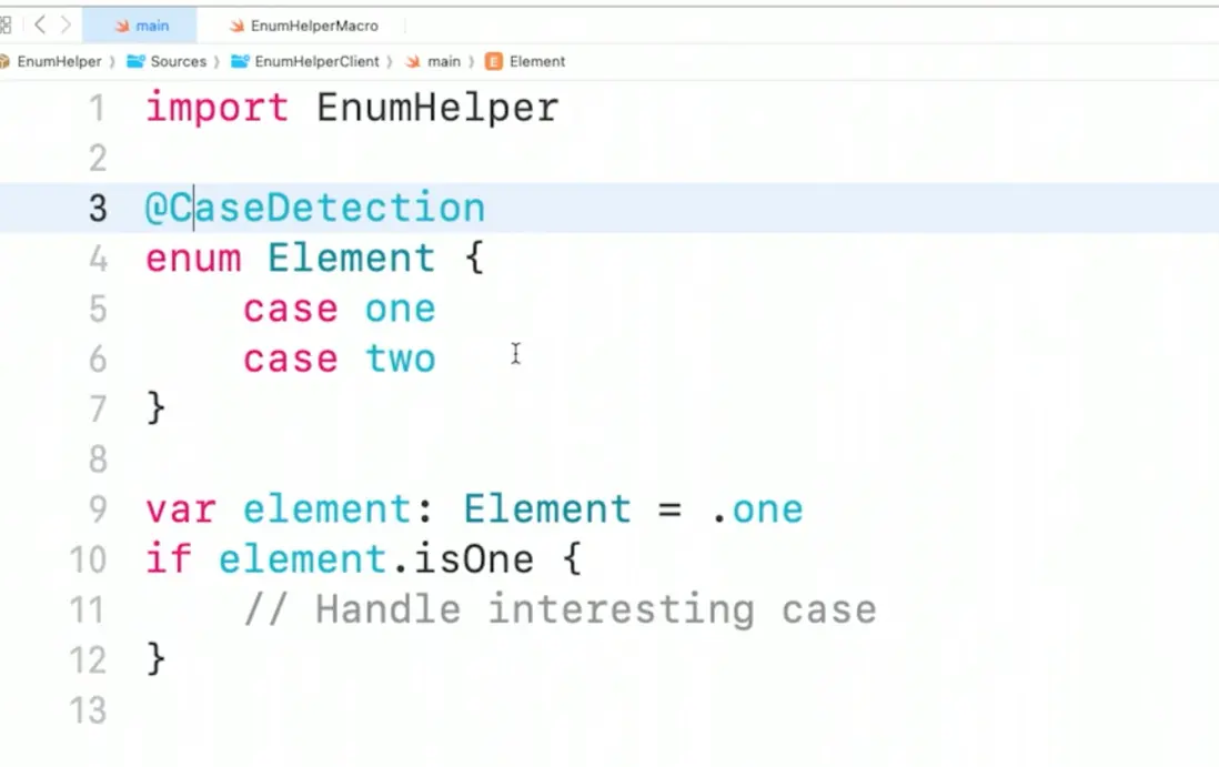 以下是一個已經實現的宏包 EnumHelper,而CaseDetection 被實現為一個宏,宏的代碼和一般的 swfit 代碼沒什麼大的區別。