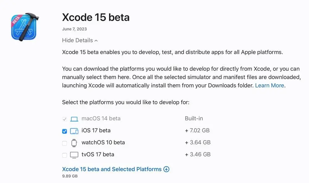 XCode 15 beta 發佈於 2023 年 6月5日, 可支持 macOS 13.3 或以上版本, 你可以按需下載需要的平台。