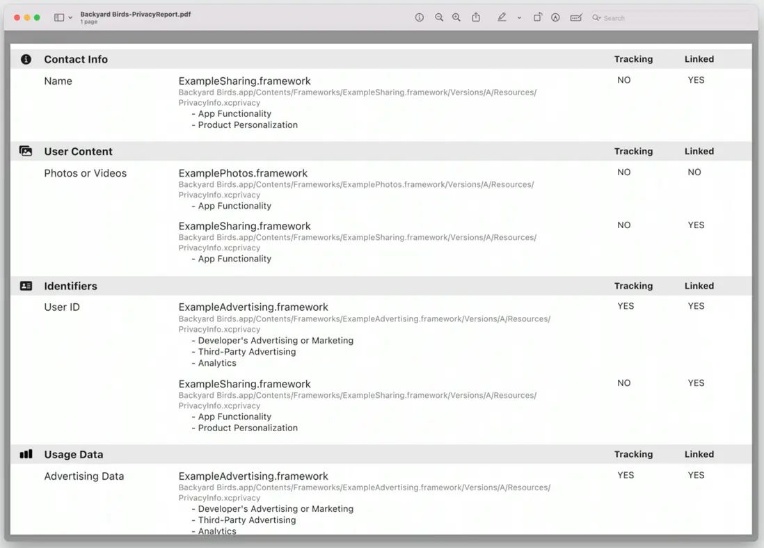 框架作者可以給自己的框架添加隱私清單,來説明隱私的使用情況和如何保護敏感數據。隱私清單會與框架捆綁一起簽名,因此,隱私清單是可被信任的。