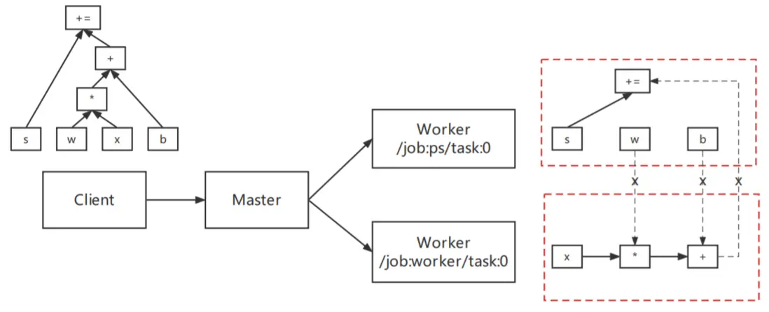 2.分佈式Master依次完成四項工作:抽取實際執行的subgraph、切分subgraph形成若干子圖片段、調度子圖片段至集羣、每個子圖片段執行前的初始化工作。