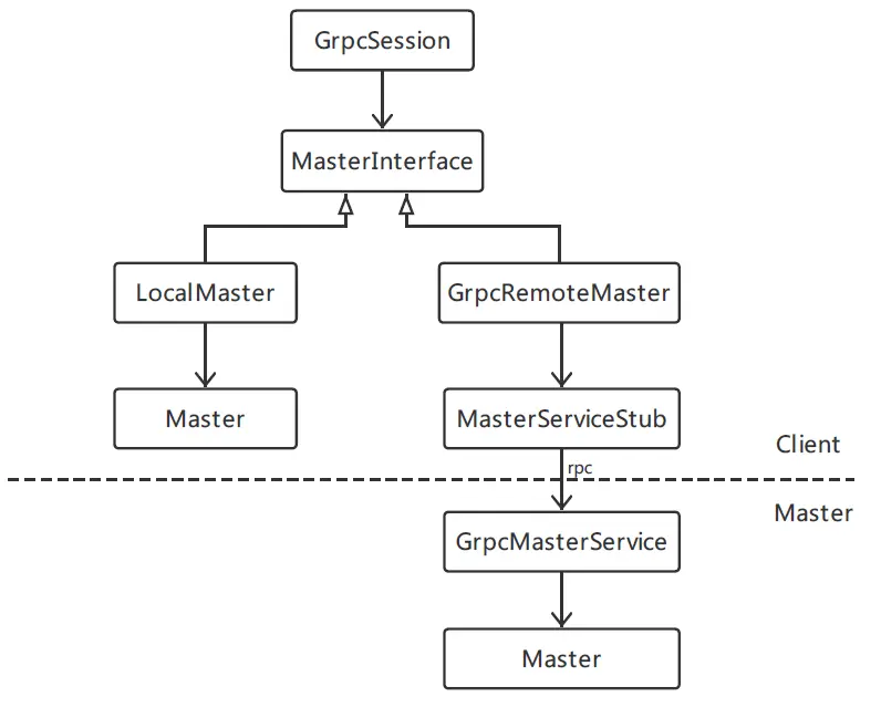 •GrpcRemoteMaster則使用gRPC來和MasterService進行通信,此時Master和Client在兩個不同的進程中。GrpcRemoteMaster的角色是gRPC客户端,它通過stub訪問遠程Master節點上的MasterService服務。
