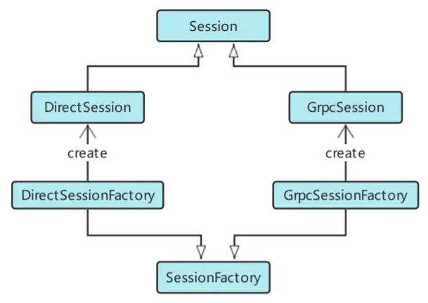 TensorFlow後端會根據前端tf.Session(target='', graph=None, config=None)創建時指定的target來創建不同的後端Session。target是要連接的TF後端執行引擎,默認為空字符串。後端Session的創建採用抽象工廠模式,如果為空字符串,則創建本地DirectionSession;如果是grpc://開頭的URL串,則創建分佈式GrpcSession。DirectSession只能利用本地設備,將任務調度到本地的CPU/GPU設備上;GrpcSession可利用遠程設備,將任務分發到不同機器的CPU/GPU上,然後機器之間通過gRPC進行通信。顯而易見,DirectionSession的定義應在core/common\_runtime/direction\_session.h中;GrpcSession的定義在core/distributed\_runtime/rpc/grpc\_session.h中。後端Session的類圖關係如下所示: