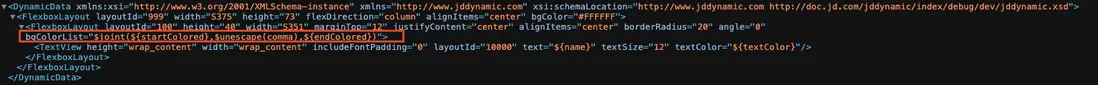 <FlexboxLayout bgColorList="$joint(${startColored},$unescape(comma),${endColored})">