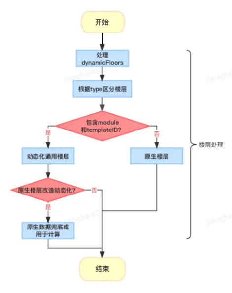 我們設定了一個動態化樓層數組dynamicFloors,裏面的每個元素代表了某一樓層的數據。type用於確定樓層類型,對於動態化樓層,會額外下發module和templateID,以此來區分動態化和原生樓層。如果發現下發了module和templateID,那麼自動用DynamicViewModel來解析,將data設置進數據源,然後用CommonTableViewCell來加載和展示樓層。流程圖如下: