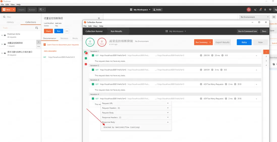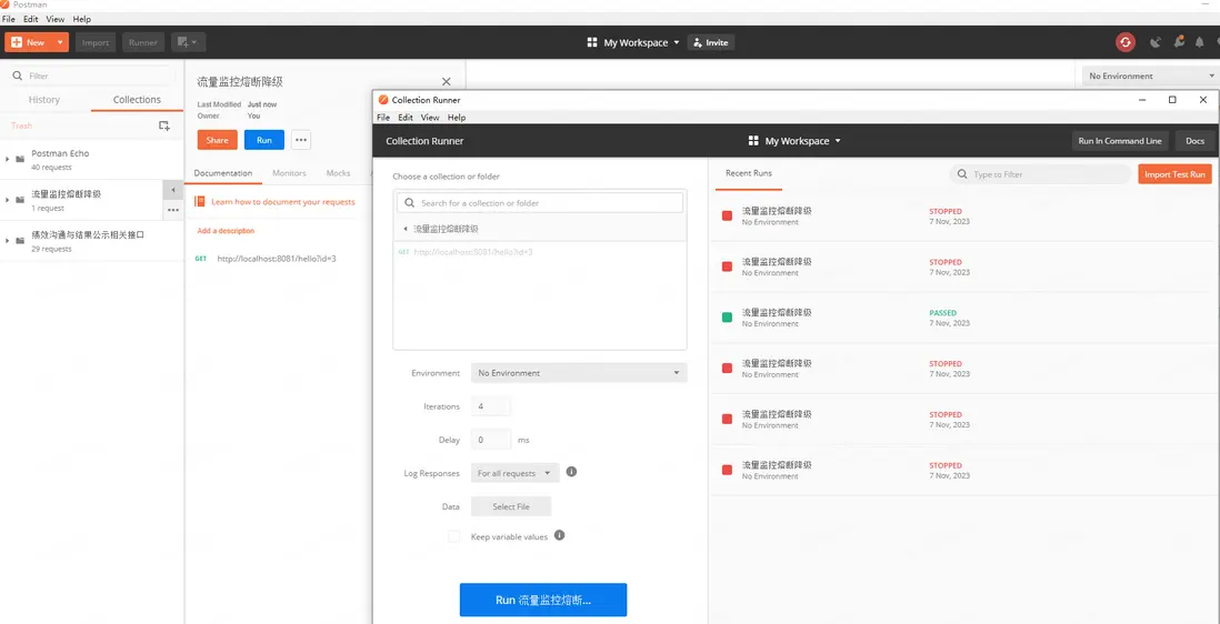 這裏我們用postman進行壓測,填寫請求的路徑保存。並點擊run調出壓測執行器