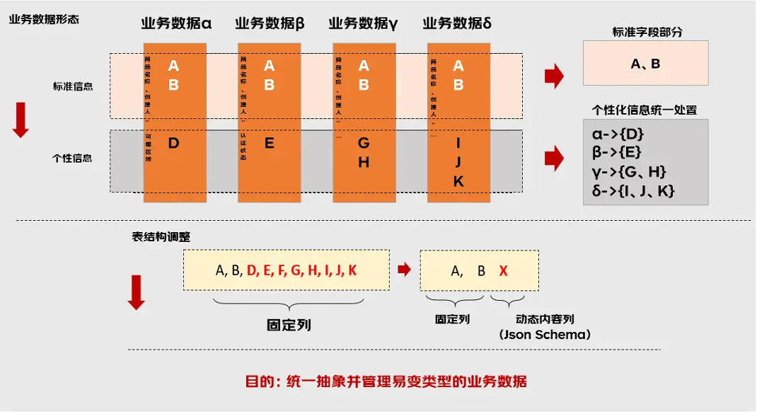 將服務端底層業務數據存儲結構由傳統主表字段信息拆分成標準信息、個性信息兩部分。其中標準信息指那些用於存儲標準通用、穩定、經常作為業務查詢檢索條件的字段,拿電商網站商品信息舉例如商品創建時間、商品名稱、商品創建人等字段;個性信息用於存儲易變、租户個性化、不經常用於檢索的字段,如商品可售區域信息、商品資質認證狀態等。將主表按以上規則劃分後,其中標準信息按原來傳統方式按列存儲,而個性化信息則打包以jsonSchema的方式整合存儲,其共同在數據庫中佔一列也稱動態列,以mysql為例這列的格式通常為”text”類型。