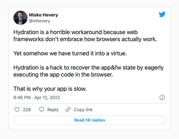 那麼,我們如何恢復WHAT(APP\_STATE + FRAMEWORK\_STATE)和WHERE呢?方法是通過下載並執行當前HTML中的組件。在HTML中下載和執行已渲染的組件是水合的昂貴部分。