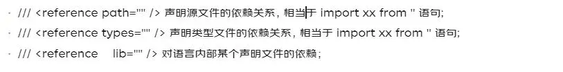 三斜線指令是一系列指令的統稱,它是從 TypeScript 早期版本就開始支持的編譯指令。目前,已經不推薦繼續使用三斜線指令了,因為可以使用模塊來取代它的大部分功能。簡單瞭解一下即可,它以三條斜線開始,幷包含一個XML標籤,有幾種不同的語法: