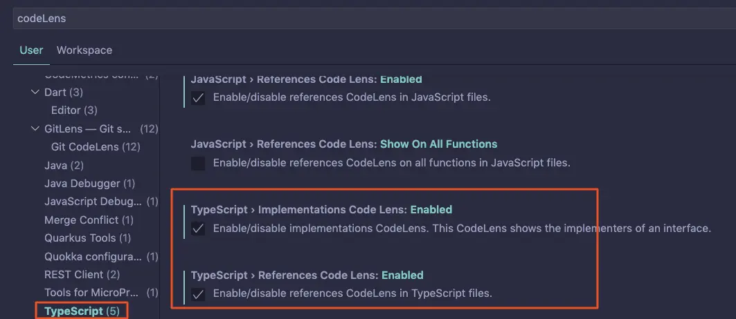 VSCode 已經內置了 CodeLens 功能,只需要在設置面板開啓,找到TypeScript 對應的 Code Lens 兩個相關選項並勾選上:
