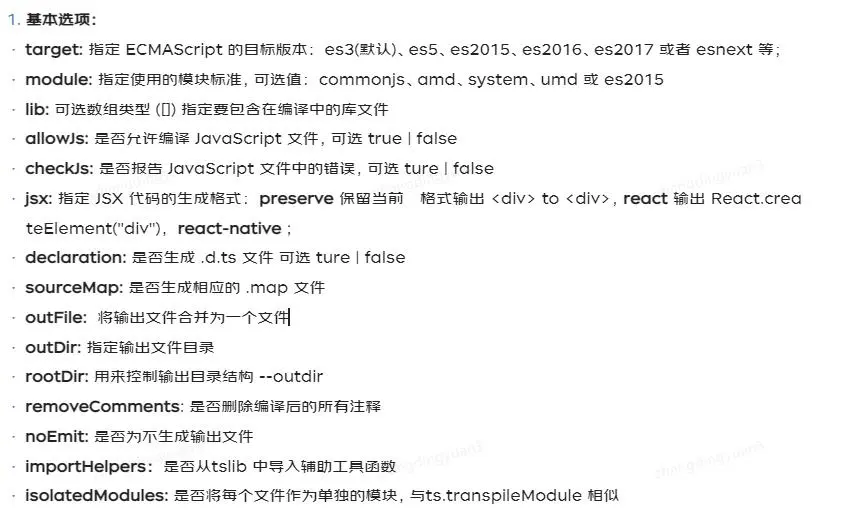 TypeScript 本身提供了只使用參數在命令行編譯 TypeScript 文件,但是在實際項目開發時我們都會使用 tsconfig.json ,如果項目中沒有此文件,可以手動創建也可以使用命令行創建(tsc —init)。使用 TypeScript 初期僅需要一份默認的 tsconfig.json 即可,它包含了一下基本的編譯選項相關信息,當我們需要定製編譯選項時就需要去了解每一項具體的含義,編譯選項解讀如下: