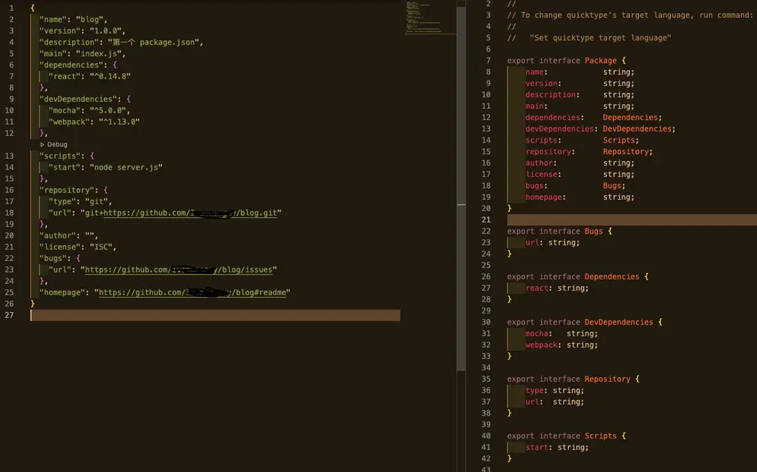 2.JSON 文件轉換類型定義(這個更常用一些):打開 JSON 文件使用Ctrl + Shift + P 找到命令: Open quicktype for JSON。下圖為 package.json 文件生成類型定義的示例:
