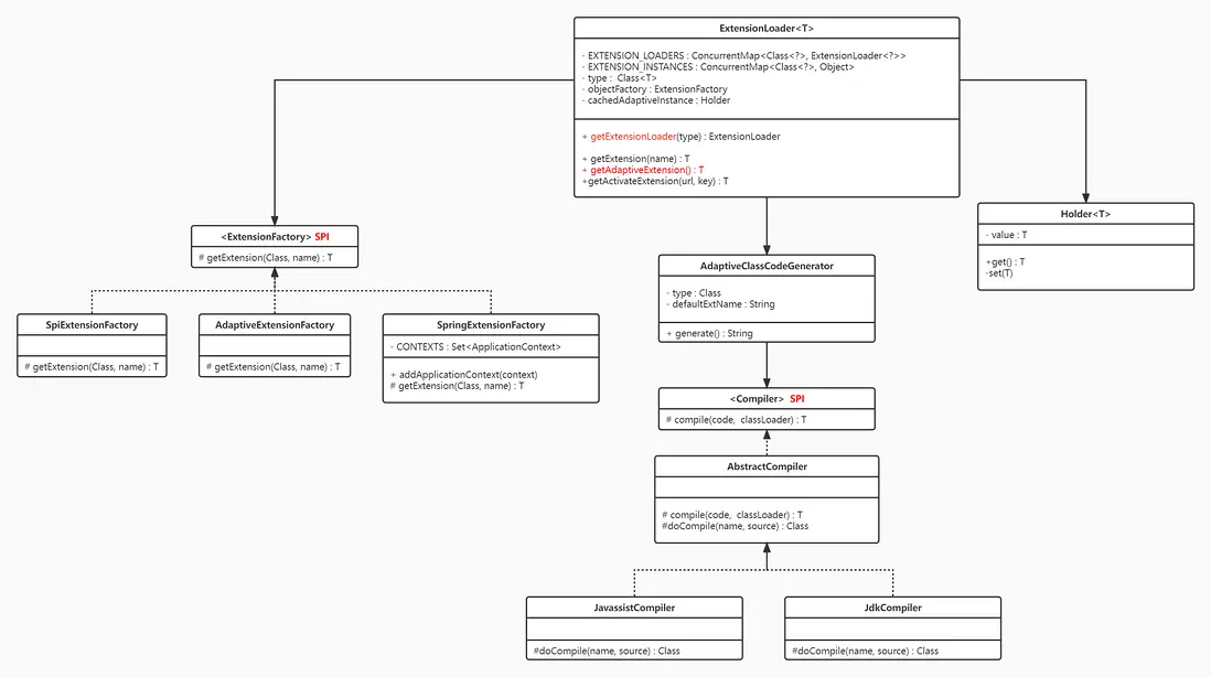 在介紹服務註冊發現之前,先簡單介紹一下貫穿整個Dubbo源碼,也是Dubbo實現自適應擴展的核心--SPI機制,下圖為Dubbo SPI實現的簡單類圖。