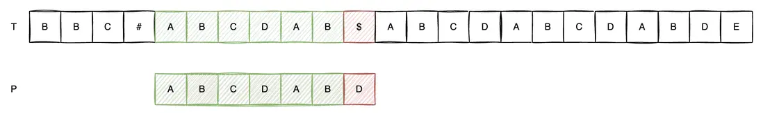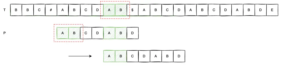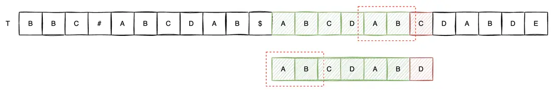 上面的例子文本串中$與模式串中D匹配失敗,而由於已經匹配成功了“ABCDAB”這6個字符,我們發現可以將模式串右移4位再進行比較,或者説此時,當匹配至模式串第7個字符失敗後,可以重新和模式串的第3個字符,也就是“C”進行比較,這是由於文本串中的“AB”恰好和模式串中的前綴“AB”相匹配。而且我們發現匹配失敗前文本串中的“AB”和已匹配的模式串中的後綴“AB”也是相匹配的。所以實際上我們根據模式串自身的特點,就能知道匹配失敗時如何去匹配新的位置。