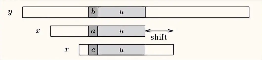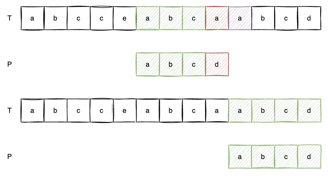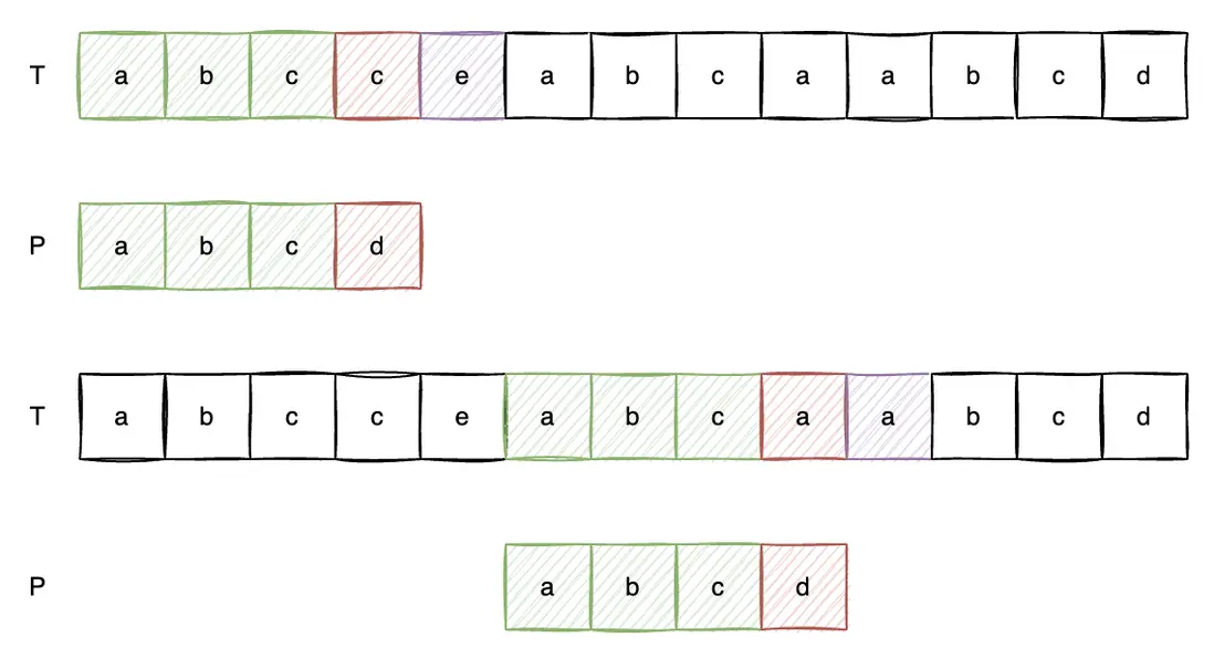 上面的優化是針對匹配成功時候的情況,那麼匹配失敗時,難道真的需要重新去枚舉其他的真前後綴,來去不斷的嘗試匹配嗎?我們觀察下,匹配失敗時,能否利用前面已經計算完的結果呢?