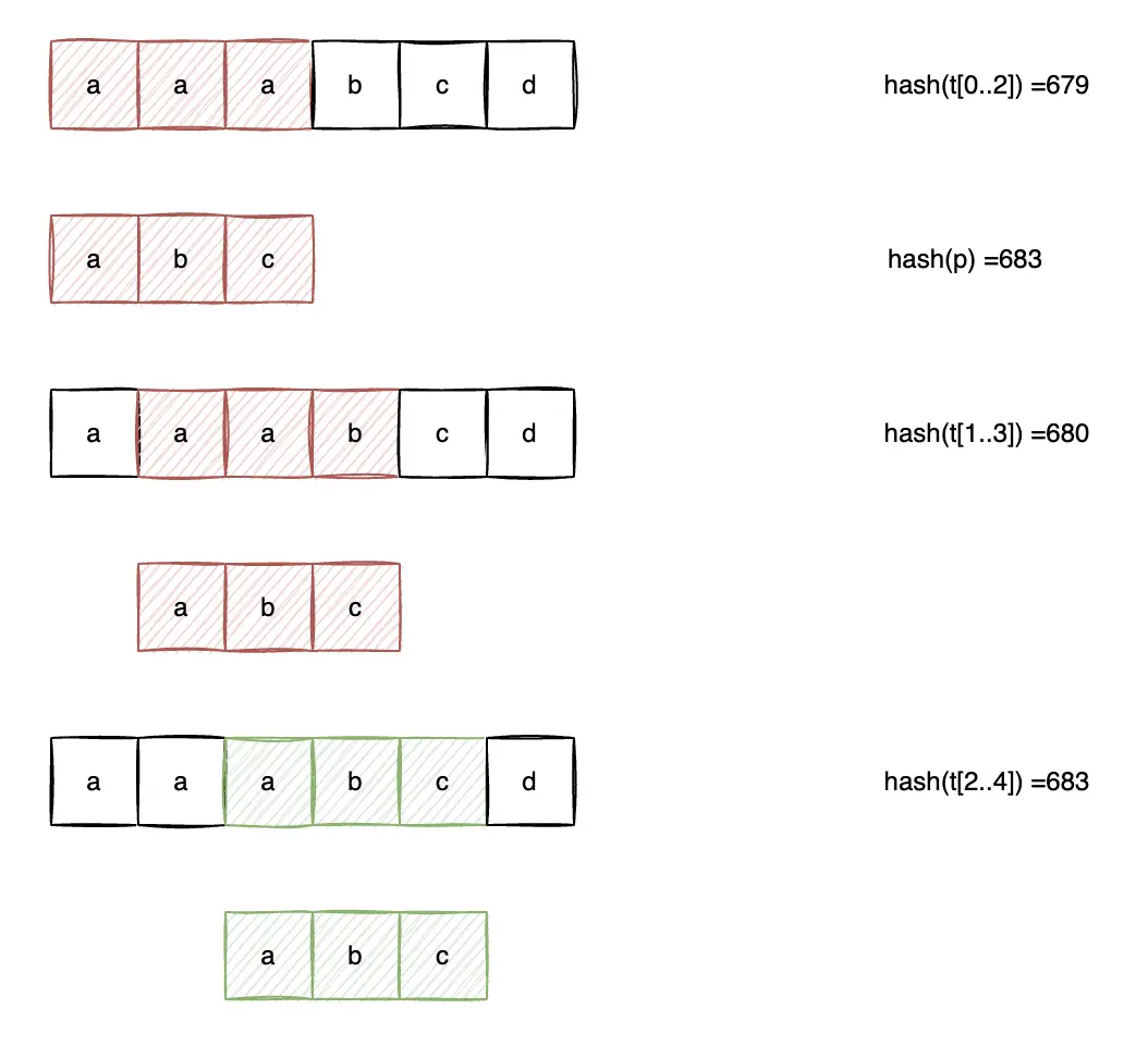 匹配過程中,不斷滑動窗口來計算文本串的hash值和模式串的是否相同,當出現相同時,還需要再檢查一遍字符串是否真正相同,因為會出現哈希碰撞的情況。