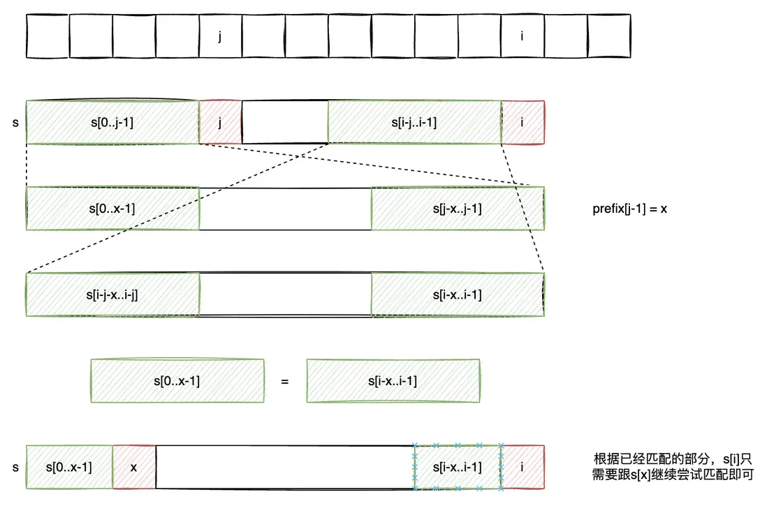 再回到原始的字符串上來觀察,s[0..x-1]正是字符串s的真前綴,而s[i-x..i-1]是以i-1為結尾的真後綴,由於這兩部分相同,我們更新j=x=prefix[j-1],準確找到已經匹配的部分,繼續完成後續的匹配即可。