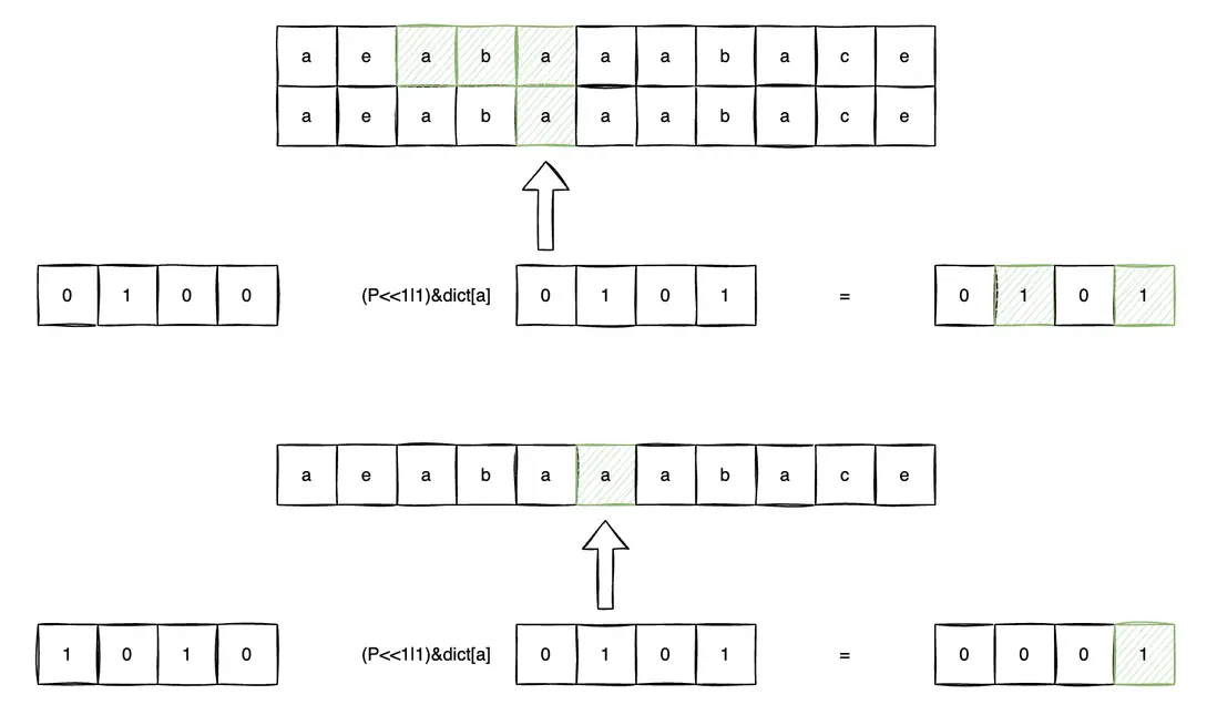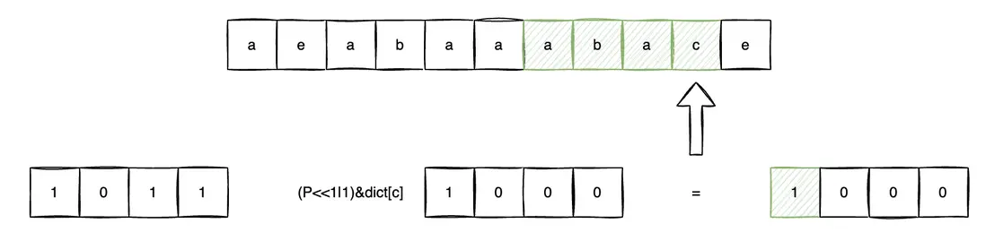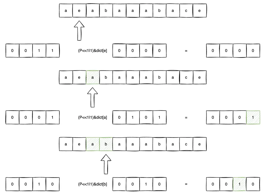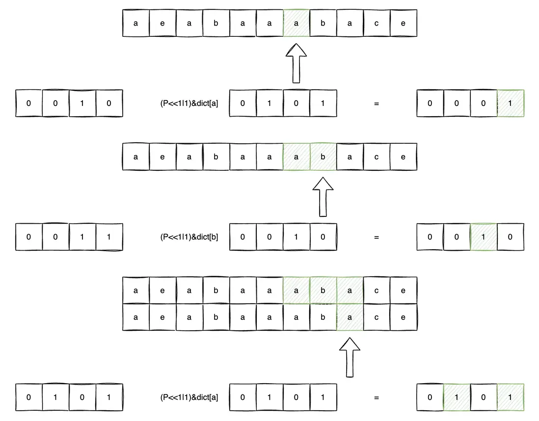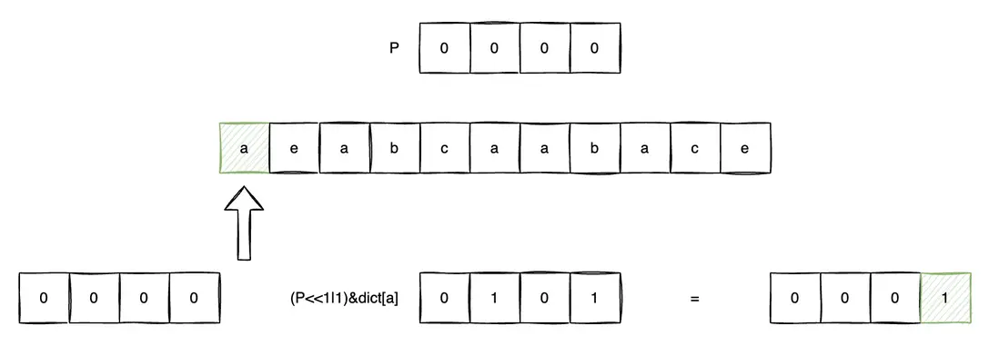進行完一次匹配後,P左移一位,將第0位置1,同時和對應字符的編碼進行&操作(即嘗試匹配該字符),更新狀態碼P。