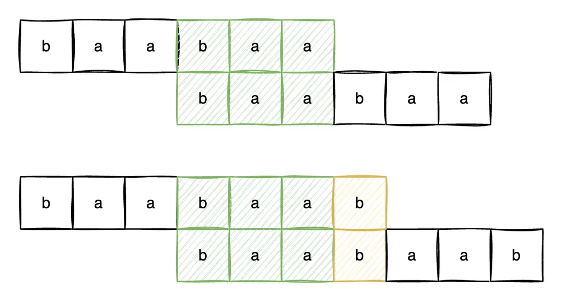 考慮一種情況,計算字符串“baabaab”的prefix的時候,在計算i=5的時候,我們已經完成了“baa”的比較,當計算i=6的時候,我們比較前綴“baab”和後綴“baab”,但是在上一次比較,我們知道前綴“baa”和後綴“baa”已經匹配了。
