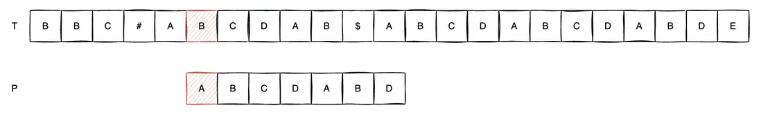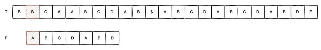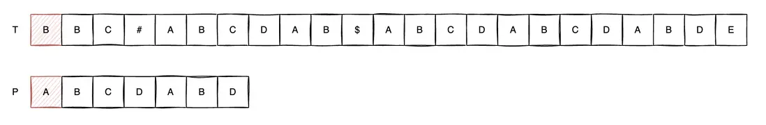 先回顧下brute force中匹配的情況。我們在文本串BBC#ABCDAB$ABCDABCDABDE中查找模式串ABCDABD,文本串中第1個字符“B”與模式串中第1個字符“A”不匹配,所以我們將模式傳後移一位。