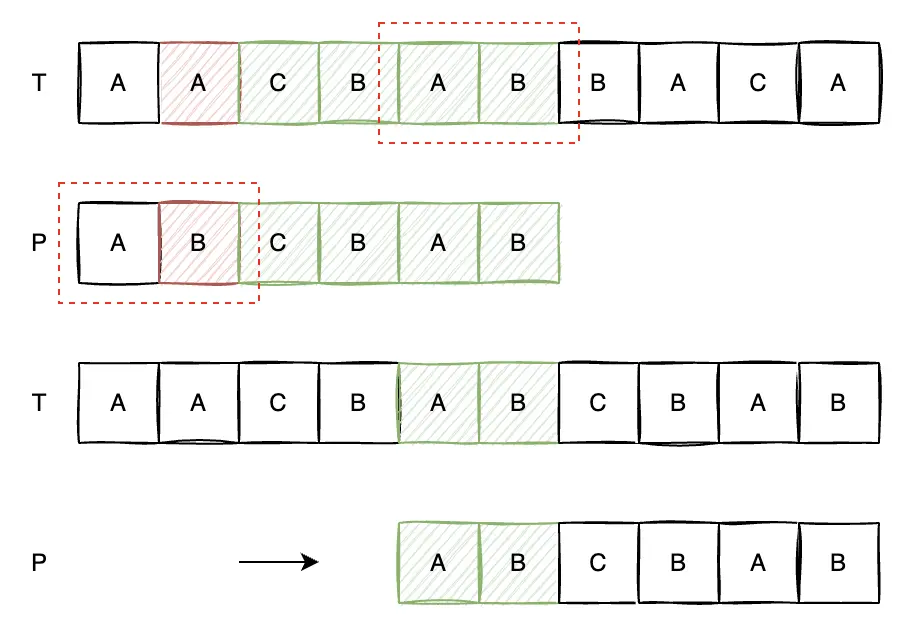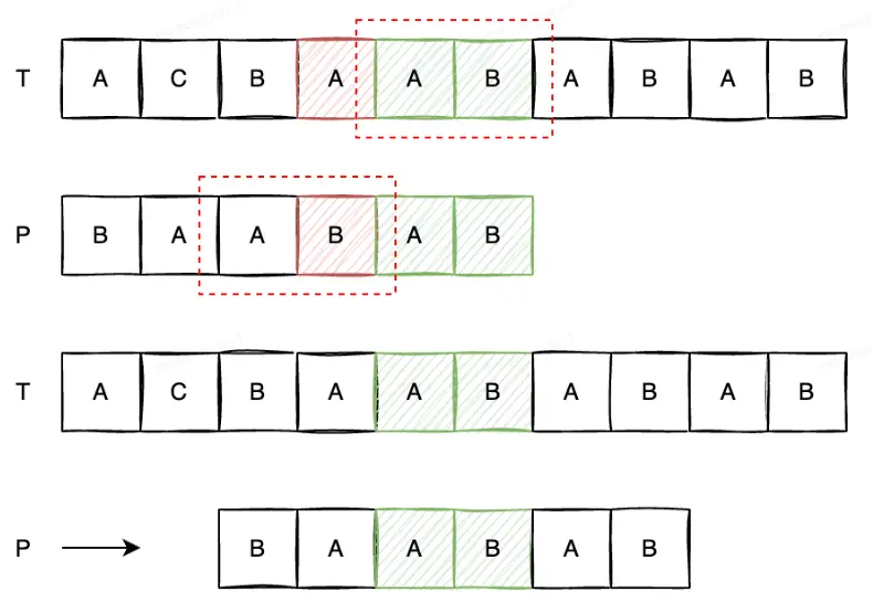 再觀察下面這種情況,已經匹配的後綴“CBAB”我們無法在模式串中找到同樣的部分,難道就沒有辦法加快匹配了嗎?我們以匹配的字符串“CBAB”中的幾個真後綴“BAB”、“AB”、“B”,其中“AB”作為前綴出現在了模式串中,那我們可以後移模式串,將文本串中的後綴“AB”和模式串中的前綴“AB”對齊,從而繼續進行匹配。