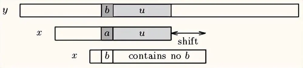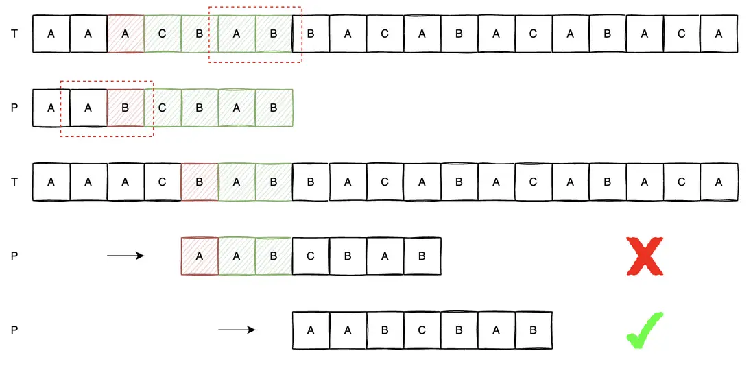 為什麼已匹配的字符的真後綴必須要和模式串中的前綴匹配才可以移動呢?我們可以看下面這個例子。已匹配的“CBAB”中的真後綴“AB”,在模式串中是存在的(非前綴),那我們向後移動模式串把這兩部分對齊繼續匹配如何呢?這樣做看似合理,但實際上卻是一個無效的匹配位置。很明顯,因為文本串中“AB”前的字符和模式串中“AB”前的字符一定是不匹配的,否則我們是可以找到一個比“AB”更長的匹配,且這個匹配的一定是模式串中的前綴,這就符合我們上面説的情況了。所以當沒有能夠匹配上合理後綴這種情況出現時,正確的移動是將模式串向後移動m位。
