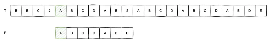 那我們不妨觀察下,上次匹配失敗的情況,當文本串中“$”與模式串中“D”不匹配時,我們其實已經完成了6次匹配,也就是説我們在文本串和模式串中已經找到了"ABCDAB"。同時我們可以發現模式串中前綴“AB”是可以和文本串中已匹配成功部分的後綴“AB”相匹配,我們利用這個信息,可以把模式串右移多位,而不僅僅是1位來去繼續匹配(換句話説,我們不需要回退文本串的搜索位置),這加快了搜索速率。
