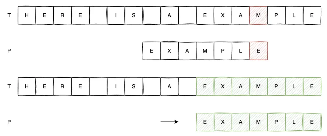 繼續觀察下面匹配失敗的情況,我們可以發現,模式串後三個字符“E”、“L”、“P”一定無法和文本串中的字符“M”進行匹配。換句話説,直到移動到模式串中最右邊的“M”(如果存在的話)之前,都是無法匹配成功的。基於這個觀察,我們可以直接向後移動模式串,使最右邊出現的“M”和文本串中的“M”對齊,再去繼續匹配。