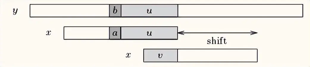 再將s[i-j..i-1]展開來看一下,因為我們知道s[0..j-1]和s[i-j..i-1]是相同的,所以s[i-j..i-1]也同樣存在相同的真前後綴,即真前綴s[i-j-x..i-j]以及真後綴s[i-x..i-1],而且由於s[0..x-1]和s[j-x..j-1]是相同的,s[j-x..j-1]和s[i-x..i-1]是相同的(整體相同,對應的部分也是相同的),可以容易得到s[0..x-1]和s[i-x..i-1]是相同的。