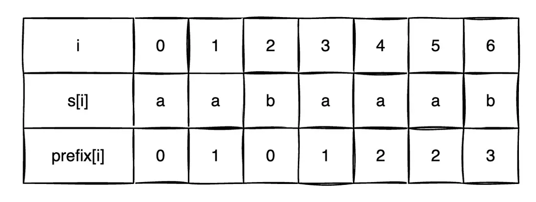 i=6時,子串“aabaaab”,其中[aab]aaab aaba[aab]最長的相同真前後綴為aab,prefix[6]=3