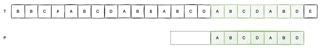 2.如果不存在和已匹配後綴完全匹配的子串,則在已匹配後綴中找到最長的真後綴,且是模式串的前綴(t[m-s…m]=P[0…s])