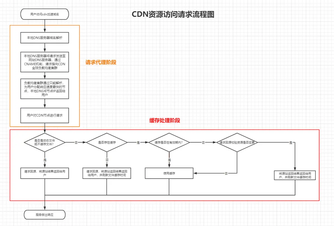 由圖我們可以看出CDN的主要處理邏輯集中在緩存處理階段,除了關注CDN緩存的文件類型及時間外,我們還需要引入一個概念——回源,客户端請求訪問資源時,如果CDN節點上未緩存該資源,或者部署預熱任務給CDN節點時,CDN節點會回源站獲取資源。如圖中所示,接入cdn後,我們提供服務的服務器就是源站,源站一般情況下只會在cdn節點沒有資源或cdn資源失效時接收到cdn節點的資源請求,其他時間,源站並不會接收請求。簡單的概括就是,沒有資源就去源站讀取,有資源就直接發送給用户。值得注意的是cdn中有s-maxage=0、max-age=0、no-cache、no-store、private中的任一種時候,該類型文件就被認定為不緩存文件,就是所有請求直接轉發源站,只有當緩存時間大於0且緩存過期的時候,才會與源站對比緩存是否被修改。