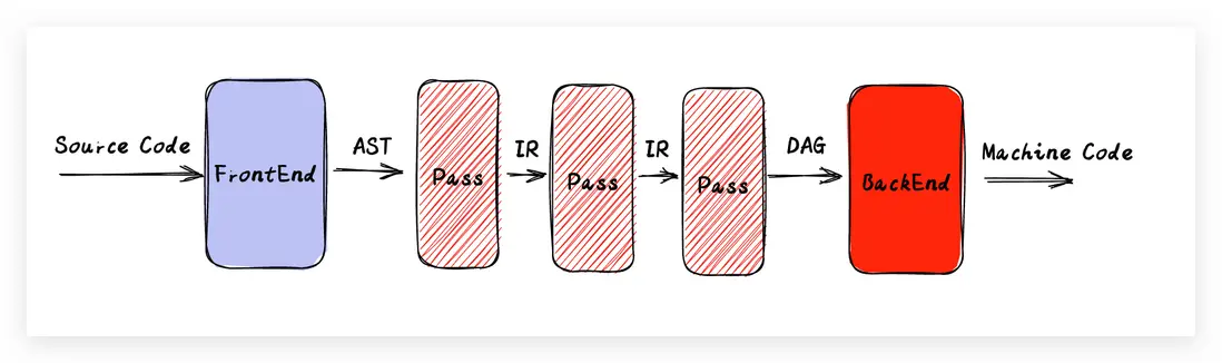 對於傳統的編譯器,主要分為前端、優化器和後端,引用一張通用的簡潔的編譯過程圖,如下: