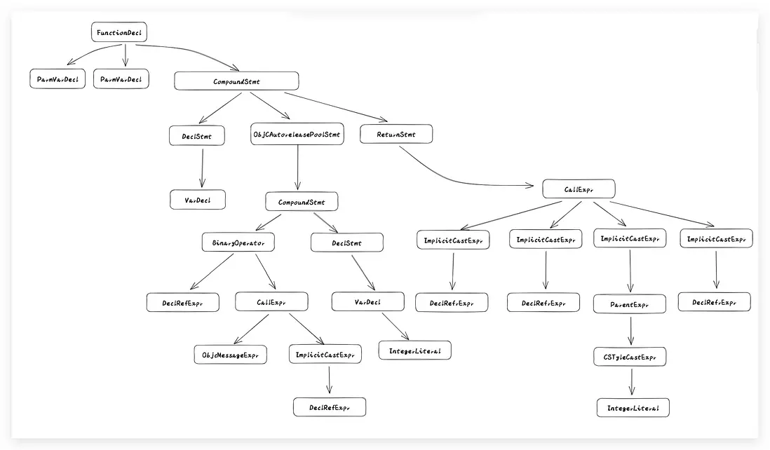 通過對原子token的組合解析,最終會生成了一個抽象語法樹(AST),AST抽象語法樹將源代碼轉換成樹狀的數據結構,它描述了源代碼的內容含義以及內容結構,它的生成能夠讓計算機更好的理解和處理中間產物。以XCode生成的默認項目的main.m內容為例,在 clang 中我們依舊可以查看具體的抽象生成樹(AST)的樣子,可以對源碼進行如下的編譯: