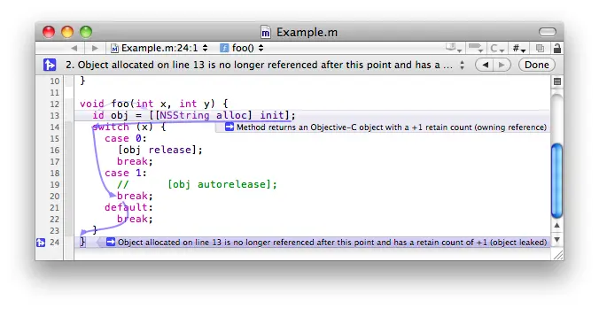 靜態分析它能夠幫助我們在編譯期間自動查找錯誤,比起運行時的時候去找出錯誤要更早一步,可以用於分析 C、C++ 和 Objective-C 程序。編譯器通過靜態分析依據AST中節點與節點之間的關係,找出有問題的節點並拋出警告錯誤,達到修改提醒的目的。比如官方文檔中介紹的內存泄露的靜態分析的案例: