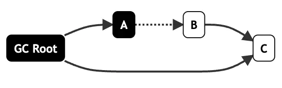 那麼如果這時A對象取消了對B對象的引用,而GC Root增加了對C對象的引用,GC Root作為黑色標記不會再次被掃描,那麼C對象在標記階段結束後仍然會保持白色,就會被清除掉。