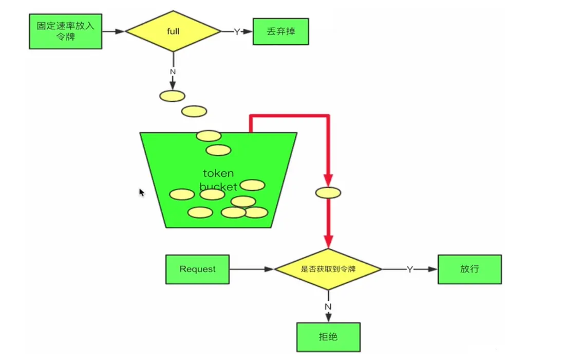 從圖中我們可以看到,令牌桶算法比漏桶算法稍顯複雜。首先,我們有一個固定容量的桶,桶裏存放着令牌