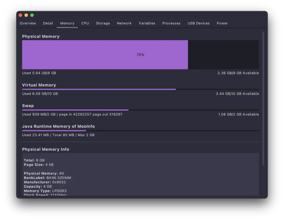 以上內存佔用查看使用我之前做的一個工具,MooInfo:
