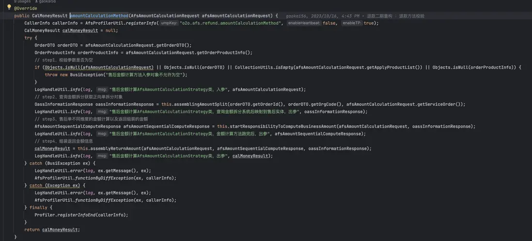 - 分析代碼壞味道:使用代碼靜態分析工具或手動檢查代碼,識別出可能存在的代碼壞味道;例如退款業務中存在1000多行的類、600多行的方法,過多的變量參數、諸多重複代碼等代碼壞味道。