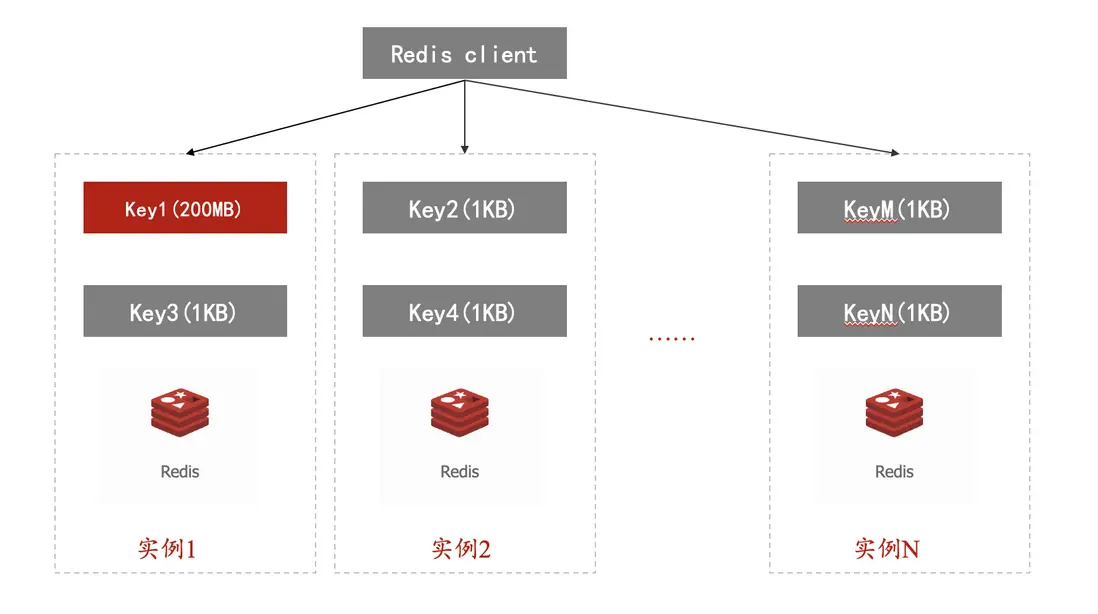 數據量傾斜:某節點中key的大小高於其他節點中的Key,如下圖,實例1中的Key1存儲高於其他實例。